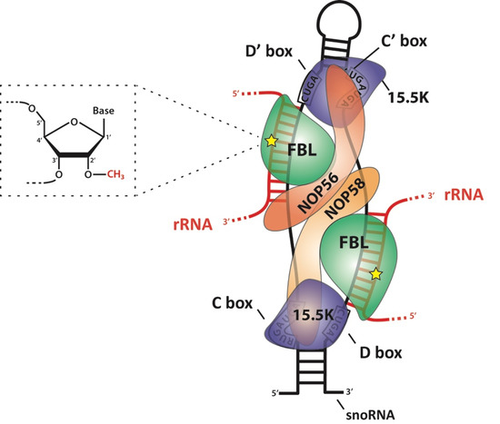 2′-O-Methylation is added to rRNA post-transcriptionally by ribonucleoprotein (snoRNP) complexes containing C/D box family small nucleolar RNAs (snoRNAs), thus termed C/D snoRNP complexes, in which the snoRNA defines the nucleotide to be methylated by sequence complementarity with rRNA (Figure 1). snoRNA-mediated guidance is also used to specify ψ sites (see [5]). This differs from stand-alone enzymes that directly ensure substrate specificity and represents the main mechanism of base modification. However, there are some exceptions, for instance, the acetylation of two bases of the yeast 18S rRNA, the modification of which is carried out by Kre33, and substrate specificity guided by snoRNAs snR4 and snR45 [6]. The assembly and composition of C/D snoRNP complexes have been reviewed extensively and is simply summarized herein [2,7,8,9]. In addition to one C/D box snoRNA, C/D snoRNPs contain the methyltransferase fibrillarin (FBL, Nop1 in yeast), the RNA binding protein 15.5K (also named NHP2L1, and Snu13 in yeast), and the heterodimer of two closely related proteins NOP56 and NOP58. Methyltransferase fibrillarin uses S-adenosyl methionine (SAM) as the methyl donor. C/D box snoRNAs are defined by two conserved sequences named C (RUGAUGA, where R is a purine) and D boxes (CUGA), which are usually present in duplicate (the second set is marked C′ and D′) and flank an antisense sequence to the targeted rRNA. C/D box snoRNPs are structured in a manner that positions the catalytic site of FBL directly opposite the nucleotide to be methylated, within the duplex formed by the guiding snoRNA and the targeted rRNA, precisely five nucleotides upstream of a D box (or D′) [10,11,12]. The archaeal C/D sRNP complex is the main model used to study this structure, due in part to the difficulty in assembling the eukaryotic snoRNP complex in vitro. Some controversy remains as to how the complex is specifically organized. Several studies have revealed how rRNA/snoRNA base pairing, 15.5K (named L7ae in archaea), and the NOP56/NOP58 dimer (Nop5 homodimer in archaea) are instrumental in positioning the FBL catalytic site and the methyl donor SAM within close proximity of the 2′-OH group to be methylated [12,13,14,15].