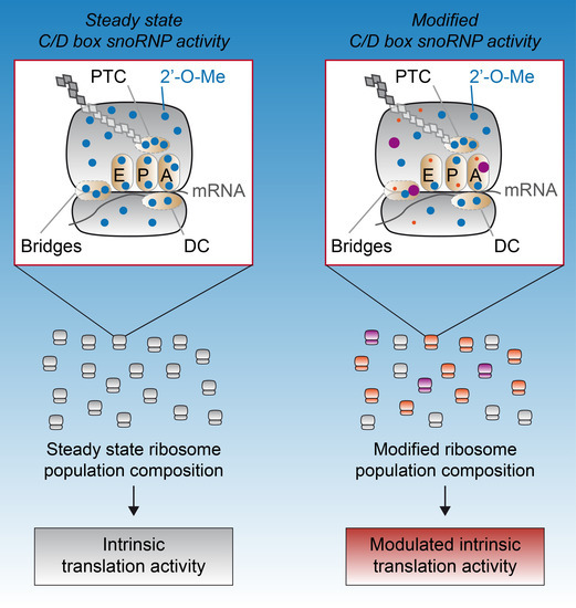 Model of 2′-O-methylation (2′-O-Me) profile modulation and its consequence on the intrinsic translational activity of ribosomes. In this model, we represent two possible states: a steady state and a modified state. Following a change in C/D box snoRNP activity (e.g., change in FBL or SNORD expression) during ribosome biogenesis, 2′-O-Me levels change in a site-specific manner as revealed in [30,31] (unchanged level: blue dots; decreased level: red dots; increased level: purple dots). 2′-O-Me is altered in key functional regions of the ribosome, including the inter-subunit bridges, the decoding center (DC), and the peptidyl-transferase center (PTC), the latter being located close to the transfer RNA (tRNA) binding sites (A: aminoacyl-tRNA binding site; P: peptidyl-tRNA binding site; and E: exit site) [25,26]. The ribosomal population changes in its composition and variety (gray, orange, and purple ribosomes). When tested in an in vitro cell-free translation assay, these ribosomal populations exhibit a differential translational activity [25]. mRNA: messenger RNA; snoRNA: small nucleolar ribonucleoprotein; SNORD: C/D box snoRNA gene.