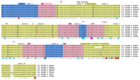 Amino acid sequence alignments for vertebrate CerS6 enzymes: See Table 1 for sources of sequences; * shows identical residues for polypeptides; - similar alternate residues; - dissimilar alternate residues; exon start sites are underlined and in bold; predicted lumenal sites are shown in blue; predicted transmembrane sequences are in pink and numbered TM1–5 from N-terminal end; predicted cytoplasmic regions are in yellow; a predicted homeobox DNA binding domain (residues 66–127) is shown by black arrows; the Lag 1p motif (residues 202–253) is denoted by violet arrows; two predicted N-glycosylation sites in lumenal regions are shown in red; the two adjacent histidine residues (His) in the active site are in magenta; the acidic C-terminal domain is indicated, with acidic amino acid residues marked in brown and C-terminal serine (Ser) residues subject to phosphorylation shown in grey; 21 conserved residues for all CerS1–6 and yeast LAC1 sequences are shown in cyan; zfish refers to the zebra fish sequence. Note differences in sequences between human CERS6.1 and CERS6.2 isoforms. Sequence alignment has been completed using CLUSTAL Omega (EMBL-EBI, Hinxton, Cambridgeshire, UK, https://www.ebi.ac.uk/Tools/msa/clustalo/).