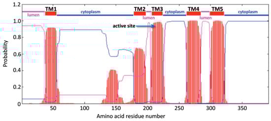 Predicted transmembrane organization for human CERS6 enzyme. Regions of hydrophobicity are shown as striped red segments, with five transmembrane domains (TM1–5) identified (TMHMM Server v. 2.0, DTU Bioinformatics, Kongens Lyngby, Denmark). Predicted lumenal and cytoplasmic regions are shown in magenta and blue lines; the His211-His212 residues of the active site were positioned within TM3. Y-axis: probability (0–1) of forming a transmembrane helix; X-axis: amino acid position within human CERS6.