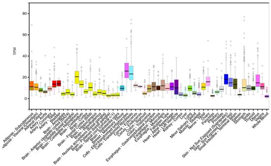 Comparative tissue expression levels for human CERS6. RNA-seq gene expression profiles across 53 selected tissues (or tissue segments) were obtained from the public database for human CERS6, based on expression levels for 175 individuals (Data Source: GTEx Portal, GTEx Analysis Release V6p (dbGaP, accession number phs000424.v6.p1; https://gtexportal.org/home/gene/ENSG00000172292.10). TPM, Transcripts per million, calculated from a gene model with isoforms collapsed to a single gene. Box plots show a median and 25th and 75th percentiles; points are shown as the outliers if they are above or below 1.5 times the interquartile range.