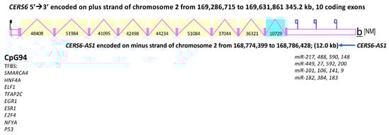 Structure of the human CERS6 gene. Derived from the AceView website [40]; the major isoform variant is shown with capped 5′- and 3′-ends for the predicted mRNA sequences; introns (pink lines) and exons (pink boxes) are shown; the length of the messenger RNA (mRNAs) (as kilobases or kb) are shown; a CpG island (CpG94) is shown for the CERS6 promoter; 15 miRNA binding sites were identified for the 3′UTR of the human CERS6 gene; the direction for transcription is shown; TFBS refers to transcription factor binding sites located within the CERS6 promoter; CERS6-AS1 refers to an antisense gene located proximal to CERS6.