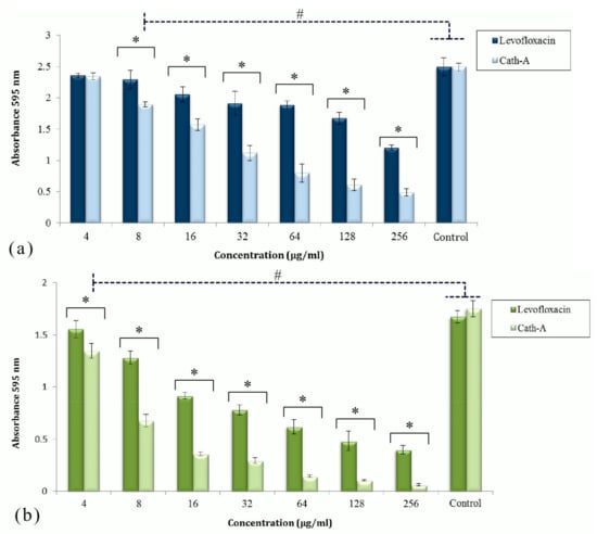 The activities of levofloxacin and Cath-A against the established biofilms of P. aeruginisa (a) and A. baumannii (b) at different concentrations (4–256 µg/mL). The antibiofilm effect of the peptide and levofloxacin was assessed by cv staining after 24 h of incubation. Biofilm formation was determined by measuring the absorbance at 595 nm using a microplate reader. Controls were untreated inoculated bacteria in Mueller Hinton (MH) broth. Data are shown as the mean ± SD of three independent tests. Significant different values were (# p < 0.05) vs controls and (* p < 0.01) with antimicrobial agents.