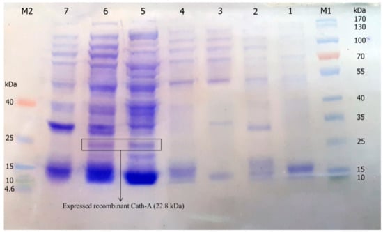 The expression of recombinant Cath-A in E. coli BL21 and 1 mM inducted isopropyl β-d-1-thiogalactopyranoside (IPTG) in the Luria–Bertani (LB) broth medium. M1: pre-stained protein ladder 10–180 kDa; lane 1: total protein before IPTG induction; lane 2–7: total protein after 3–8 h of IPTG induction at 25 °C; M2: pre-stained low range protein ladder (1.7–40 kDa).
