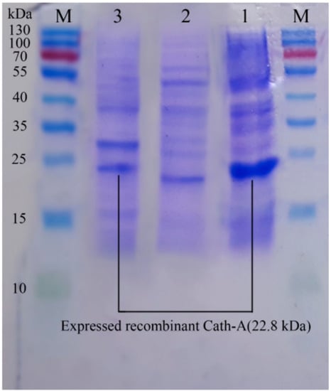 The sodium dodecyl sulfate polyacrylamide gel electrophoresis (SDS–PAGE) analysis of the expressed recombinant Cath-A in E. coli BL21 and 1 mM inducted IPTG in the Terrific broth (TE) medium. M: pre-stained protein ladder 10–180 kDa; lane 1: the expressed total protein of the recombinant vector including rec-Cath-A after 6 h of IPTG induction at 25 °C; lane 2: the expressed total protein of the original vector (pET-32a); lane 3: the expressed total protein of the recombinant vector including rec-Cath-A after 7 h of IPTG induction at 25 °C.