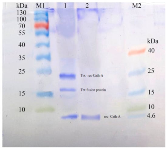 The SDS–PAGE analysis of the eluted protein fractions (according to the diagram in Figure 5) in a gradient concentration of the imidazole. The fractions were concentrated using a PEG. M: pre-stained protein ladder 10–180 kDa; lane 1: the eluted protein fraction (pick A based on Figure 5) at 17% imidazole concentration; lane 2: the eluted protein fraction (pick B based on Figure 5) at 47% imidazole concentration. The Trx-rec- Cath-A was detected in fraction B.