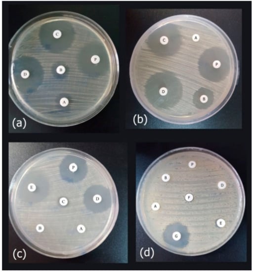 The agar disk diffusion assay of the purified peptide as compared to the synthetic peptide. In each test, approximately 20 μL of purified recombinant peptide (Cath-A) inoculated on a blank disk, P: indicated as a purified peptide in the tests, (a) Antimicrobial activity against E. coli ATCC 25922 (A–D; 2, 4, 8, 16 µg/mL concentrations of the synthetic peptide, respectively), (b) Antimicrobial activity against P. aeruginosa ATCC 27863 (A–D; 2, 4, 8, 16 µg/mL concentrations of the synthetic peptide, respectively), (c) Antimicrobial activity against the multidrug resistant (MDR) clinical A. baumannii no.7 (A–E; 1, 2, 4, 8, 16 µg/mL concentrations of the synthetic peptide, respectively), (d) Antimicrobial activity against the MDR clinical P. aeruginosa no 4 (A–G; 4,8,16,32,64 and 126 µg/mL concentrations of the synthetic peptide, respectively. The higher concentrations (i.e., 256, 500 and 1000 was displayed in Figure S2).