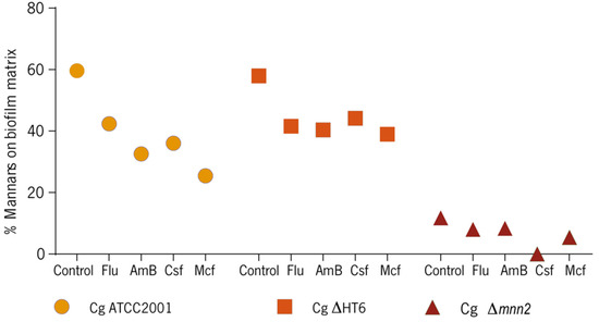 Alcian Blue binding assay in biofilm matrices of C. glabrata ATCC2001, C. glabrata ΔHT6, and C. glabrata Δmnn2. Data represent the percentage of mannans on biofilm. (Cg—C. glabrata).