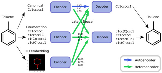 As an alternative to engineering the outcome, it is here suggested that it is possible to use SMILES enumeration or chemception image embedding [10] to create chemical heteroencoders. The concept is illustrated in Figure 2. By translating from one format or representation of the molecule to the other, the encoder–decoder network is forced to identify the latent information behind both representations. This should in principle lead to a more chemically relevant latent space, independent of the representations or canonicalization used.