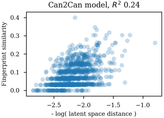 Scatter plot of the latent space similarities and the circular fingerprint similarities.