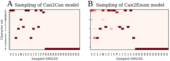 Multinomial sampling of the decoder for two different models illustrated with heat maps of the character probability for each step during decoding of the latent space. (A) the can2can model is very certain at each step and samples the same canonical SMILES each time; (B) the can2enum model has more possibilities at each step in the beginning. The probability heatmap and sampled SMILES will be different for each sampling run, depending on which character is chosen from the probability distribution at each step.