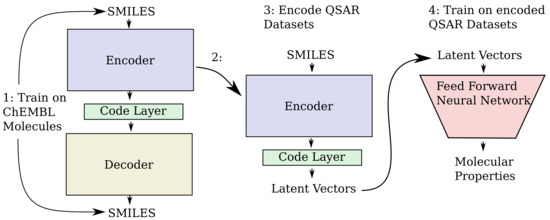 The overall steps for producing the QSAR models is illustrated in Figure 12. Training of the encoder–decoder models used on the ChEMBL datasets, resulted in final losses of approximately 0.001, 0.01, 0.10, 0.11 for the can2can, enum2can, can2enum and enum2enum configurations of the training sets, respectively. Reconstruction performance of the different encoder/decoder configurations is presented in the Table 3. The performance of the QSAR modelling done based on ECFP4 fingerprints and the different vectors obtained from the code layers of the three different neural network models are shown in Table 4. There is some improvement from the ECFP based baseline models to the can2can vector based models, with further improvement for the models based on the latent vectors encoded with the heteroencoders. The three different heteroencoders seem to produce latent vectors which perform very similar to each other in the QSAR modelling, with a tendency for the average performance to rise from enum2can to enum2enum over can2enum.