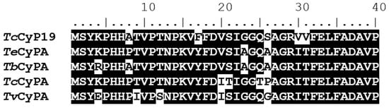Secreted Kinetoplastid cyclophilins protein sequences. The first 40 amino acid residues of T. cruzi cyclophilin 19 (Acc No. AF191832), were aligned with the protein sequences of T. evansi (TeCyPA; Acc No. ABI20435), T. brucei CyPA (TbCyPA; Acc No. U68270), T. congolense (TcCyPA; Acc No. U68268), T. vivax CyPA (TvCyPA; Acc No. U68269). Identical amino acids respect to the TcCyP19 protein sequence are shadowed.