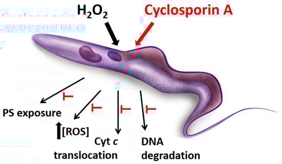 Regarding oxidative stress, CsA specifically inhibited cell death events on T. cruzi parasites under hydrogen peroxide stimulus as mitochondrial membrane depolarization, parasite DNA fragmentation, phosphatidylserine exposure to the external membrane surface, and Annexin V binding, reactive oxygen species production and cytochrome c translocation from mitochondrion to cytosol (Figure 2) [48]. This suggested that CsA would be inhibiting a regulated cell death process in this protozoan parasite, as occurs in mammalian cells by CsA-CyPD binding.