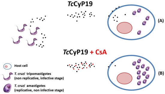 TcCyP19 is abundantly expressed in T. cruzi, and interacts with mammalian cells, a process that was partially inhibited by Cyclosporin A (CsA). The pre-incubation of cyclophilin TcCyP19 with VERO cells restrained the parasite penetration (A), and again, pre-incubation of TcCyP19 with its inhibitor CsA or specific polyclonal antibodies recovered the percentage of parasite infected cells in control experiments (B). The inhibitory penetration effect of TcCyP19 cyclophilin suggests a protective role of this protein to assure the survival of the infected tissue and allow parasite persistence.