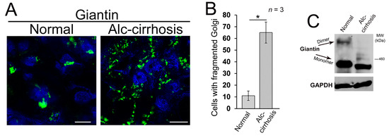 Alcohol-induced Golgi disorganization in patients with alcoholic liver cirrhosis. (A) Confocal immunofluorescence images of giantin in the liver tissue samples obtained from patients with normal liver function and patients with alcoholic liver cirrhosis; bars, 5 μm; (B) Quantification of cells with fragmented Golgi; n = 3 samples for each group. Results are expressed as a mean ± standard deviation (SD); * p < 0.001; (C) Giantin Western blot (W-B) of lysates from samples described in (A). Lysates were normalized to glyceraldehyde-3-phosphate dehydrogenase (GAPDH).