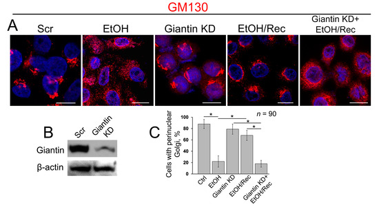 To examine the precise role of giantin in post-alcohol recovery, we monitored the Golgi morphology in VA-13 cells after EtOH withdrawal in presence of giantin siRNAs. As shown in Figure 3A and in agreement with our previous observation of these cells [16], Golgi morphology (stained by GM130) in EtOH-treated cells (35 mM EtOH for 72 h) looks predominantly disorganized, which returns to the classical perinuclear position when cells recovered after EtOH under normal growing conditions for another 48 h. As we showed previously and present here, giantin knockdown (KD) has no significant impact on the perinuclear position of Golgi morphology [22,24]. However, in cells lacking giantin, post-alcohol Golgi failed to recollect membranes into the organized structure (Figure 3A,B). The quantitative analysis indicates that cells experiencing a deficiency in giantin demonstrate the identical rate of Golgi recovery as EtOH-treated cells (Figure 3C).
