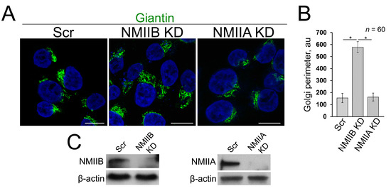 Recently we found that EtOH-induced Golgi disorganization is governed by motor protein non-muscle myosin IIA (NMIIA) [51]. Additionally, another non-muscle myosin isoform, NMIIB, is involved in exocytosis and in vesicular trafficking at the trans-Golgi and trans-Golgi network [52,53], and both NMIIA and NMIIB can be bound to F-actin. It is interesting to note that although NMIIA and NMIIB share many biochemical features, they have been found on different membrane domains and ascribed to distinct functions, such as cytokinesis and cell motility [54,55,56]. In addition, NMIIA and NMIIB remain tightly bound for different lengths of time to F-actin during the ATPase cycle [57,58]. In other words, while the complex of NMIIA and F-actin is the short-term event, the binding of NMIIB to F-actin is prolonged, suggesting NMIIB as a motor protein for generation of sustained tension [59,60]. In light of these facts, we hypothesize that NMIIA and NMIIB may play a diagonally different role in Golgi morphology. To test this, we performed siRNA depletion of both NMIIA and NMIIB in VA-13 cells. We then measured the perimeter of Golgi, using ImageJ, taking into account only membranous-specific giantin staining. As we predicted, NMIIA KD has no significant impact on Golgi [51], because Golgi size was comparable to cells transfected with scramble siRNAs (Figure 4A–C). However, in NMIIB-depleted cells, the perimeter of Golgi was significantly enlarged (Figure 4A–C). The data imply that under normal conditions, NMIIB controls Golgi integrity and could be essential for the recovery of Golgi.