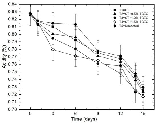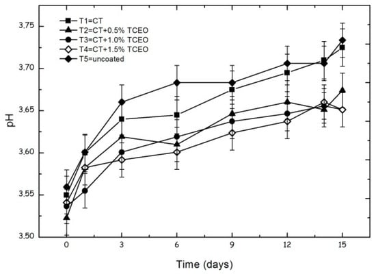 Statistical analysis indicates significant (p < 0.05) changes in pH with treatments and storage time. Compared to the control, the pH of fruits coated with TCEO, [T2 (3.53 to 3.69), T3 (3.54 to 3.67), and T4 (3.55 to 3.67)] presented significant differences (p < 0.05). From Figure 2, it can be observed that treatments with TCEO delay the pH increment, and this effect is more pronounced as the TCEO content increases. The final result is the extension of the shelf-life of strawberries and the diminishment of the effect of the maturation of the fruit through the consumption of organic acids.