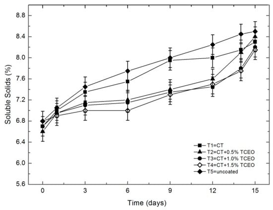 The statistical analysis indicates significant changes (p < 0.05) in the total content of soluble solids in the storage time (Figure 3). The control presented significant differences (p < 0.05) compared to the fruits covered with T2 (6.60 to 8.40), T3 (6.70 to 8.20), and T4 (6.80 to 8.15), which indicates that the coatings with Thymus capitatus prolonged the shelf-life of the strawberries by decreasing the metabolism and delaying maturation, as indicated by the results for the total content of soluble solids, which have been previously observed [62].