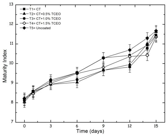 Figure 5 shows that all treatments exhibit an increase in the maturation index over the storage time, in which the average values were 11.45 for T1, 11.62 for T2, 11.41 for T3, 11.36 for T4, and 11.67 for T5, during day 15 of storage.