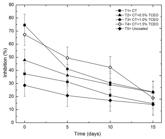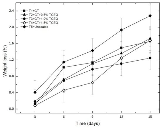 The percentage of total solids (Table 2) accounts for the fraction of the sample that does not evaporate at 105 °C, which is mainly constituted by the polymeric matrix and essential oil. The coatings that presented the highest total solid contents were those with 1.5% of TCEO, as expected, since a 2% solution of chitosan and 1.5% of essential oil should account for 3.5% of theoretical solids, which corresponds with the value measured (3.27%), suggesting that most of the oil components were retained in the polymer matrix during the analysis.