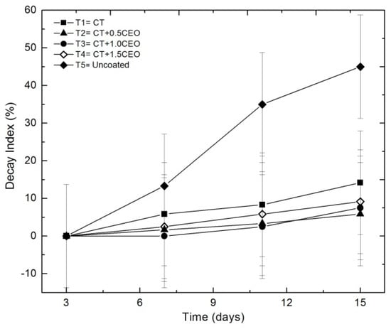 The methodology used to determine the fungal decay was reported elsewhere [52] and is briefly described here. The severity of fruit decay was evaluated visually according to the following scale: 1 = not damaged, 2 = light damage (<25%), 3 = moderate damage (>25% and <50%), 4 = severe damage (>50 and <75%), and 5 = completely damaged (75–100%) [53]. The decay index was calculated using the following formula [54]: