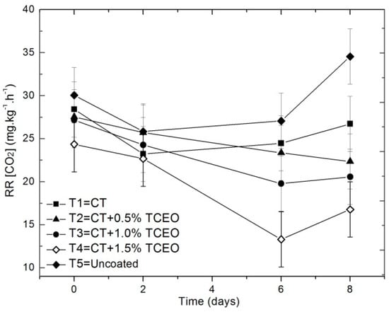 For this assay, a closed system EcoChamber ME-6667 (PASCO, Roseville, California, United States) equipped with carbon dioxide sensor PS-2110 was used to measure the respiration rate. This was done in a 0.655 L hermetically sealed glass jar, equipped with a septum on the lid to take gas samples in the upper space, at different times for 10 h, every 30 min, using a needle connected to the gaseous CO2 analyzer on days 0, 2, 6, and 8, for each treatment.