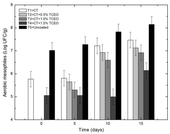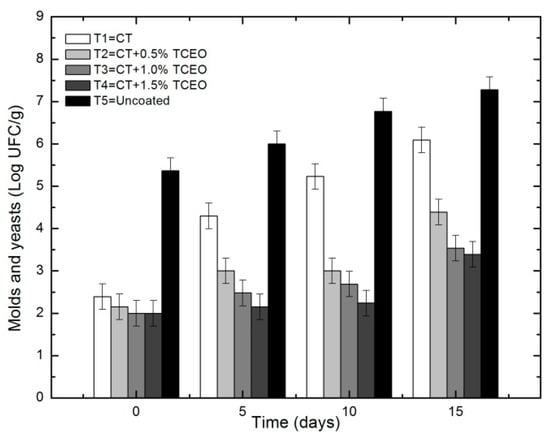 Our group reported the physical-chemical properties and antibacterial activity of chitosan coating incorporated with Thymus capitatus essential oil (TCEO) against the bacteria involved in the spoilage of tuna and swordfish [41]. A commercial TCEO was selected, as it contained reinforced main components and had a high degree of purity, which proved to be an advantage in increasing antimicrobial properties and in decreasing the fungal decay of fruits [41].