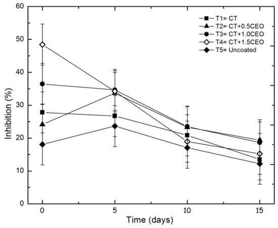 Figure 4 shows that acidity values decrease progressively as a function of storage time for all coated samples and control.