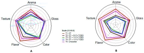 The test was carried out in the nutrition and dietetics laboratory of the Universidad del Atlántico, with the participation of 30 untrained panelists, considering the Colombian Technical Standard 3932 [55]. Two groups of 15 judges were formed, which performed the test independently during days 4 and 7 of the application of the coatings on the product, with a prior instruction.