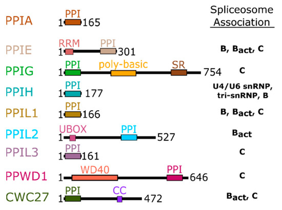 Domain organization of the nuclear cyclophilins. Colors are consistent throughout all figures. Spliceosome association is modified from [17,18] and is further shown in Figure 3.