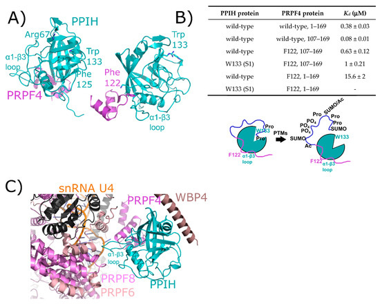 The interaction between PPIH and PRPF4 seen in solution is preserved in early spliceosomes. (A) The complex between a small peptide from PRPF4 and the PPIH isomerase domain is shown in cartoon representation (PDB ID: 2MZW) [40,41,42]. Key catalytic site residues are highlighted, and in the right panel the high-affinity interaction between Phe122 and the α1–β3 loop of PPIH is shown. In (B), a table summarizing the high- and low-affinity sites between PRPF4 and PPIH. Below, a model of the proposed function of the high- and low-affinity sites. Panels (A,B) are modified from their original form in [32]. (C) The neighborhood around PPIH in the B complex human spliceosome (PDB ID: 5O9Z). In addition to the previously known interaction with PRPF4, potential interactions with WBP4, PRPF6, and PRPF8 are highlighted. U4 snRNA is within 10 Å of PPIH and is labeled. Proteins in dark grey are further than 10 Å away from PPIH and are not candidates for direct interaction, so are not labeled. The region of PRPF4 forming the low-affinity interaction with PPIH (the extreme N-terminal 100 residues) is disordered in this structure. Ac: Acetylation; SUMO: Small Ubiquitin-Like Modifier.
