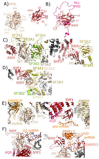 In human spliceosomes, PPIE has been built into four structures: two representing pre-catalytic B complexes, and two representing the catalytic C complex [26,27,28]. Both the RRM and isomerase domains are modeled into density in all these structures, providing novel insight into the particular interactions mediated by each domain. In the mature Bact structure, the region around Pro83 of splicing factor 3B, subunit 4 (SF3B4) is pointed towards the active site of PPIE (Figure 5C). Other interactors include splicing factor 3B, subunit 2 (SF3B2), also with the catalytic face of PPIE, and splicing factor 3A, subunit 2 (SF3A2), which interacts both with the cyclophilin and RRM domain of PPIE. In addition to extensive contact with SF3A2, the RRM motif is also potentially interacting with SYF1. These interactions are largely with the α-helix and loop regions of RRM, as opposed to the β-sheet mediated interaction with MLL1 (Figure 5B). In the late Bact spliceosome, this protein network surrounding PPIE is largely unchanged.