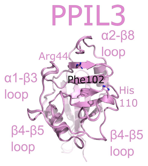 PPIL3 is a minimal cyclophilin. Initial studies called PPIL3 CypJ [62]. The structure of the isomerase domain of PPIL3 was solved via crystallography and initially described in [52]. A later structure of PPIL3 in apo form, and bound to cyclosporine, is also available in the PDB (Figure 8). Several spliceophilins, including PPIL3, PPIL2 and CWC27, are first found in Bact complex. However, unlike PPIL2, PPIL3 is most abundant in C complex [17,18]. Although multiple cryo-EM structures of Bact and C complex exist, PPIL3 has not been successfully modeled into density.