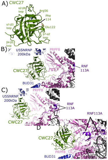 The isomerase domain of CWC27 has been modeled into three spliceosomal complexes [25,26]. In the mature Bact complex, U5 snRNP 200 kDa interacts with the α2–β8 region of CWC27; BUD31 is found near the β4–β5 loop; PRPF8 interacts with both the β4–β5 loop and β7–α2 region; and RNF113 (RING finger protein 113) interacts with the C-terminal linker region between the PPI and the low complexity region of CWC27, which is apparently disordered (Figure 9B). In the late Bact complex the CWC27 interaction environment is quite similar, save for the absence of BUD31 and slight movement of PRPF8 (Figure 9C). Finally, in the Bact complex of Haselbach et al. [25] the modeled interactions are comparable. In this structure, more of RNF113 can be modeled in, including an additional, extensive interaction with β1–β2 of CWC27. The model includes BUD31 but not U5 snRNP 200 kDa is not (Figure 9D) [25]. Note that in all structures, only the isomerase domain of CWC27 can be modeled, leaving roughly 200 residues uncharacterized.