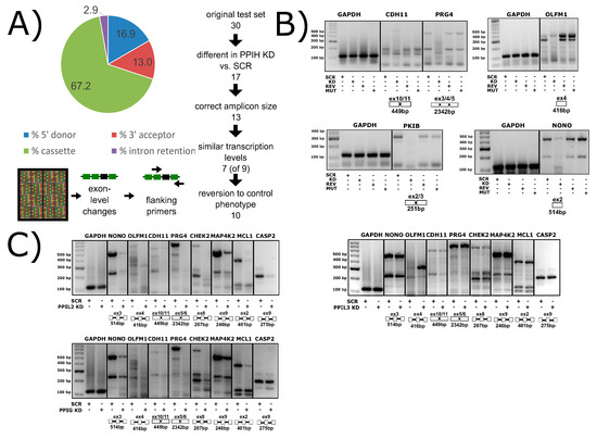 Clones from the MISSION® (Boston, MA, USA) TRC-Hs human libraries were used to create stable knockdown lines in human cells (HEK293T except for PPIH, in HeLa). All human cell lines were a generous gift from Dr. Mauricio Reginato, Drexel University, Philadelphia, PA, USA. Two to five sequences of short hairpin RNA (shRNA) were tested to ensure acceptable knockdown of mRNA and protein (60% KD or greater). Complementary DNA (cDNA) from triplicate samples of PPIH knockdown were submitted for microarray analysis using the GeneChip® Human Transcriptome Array 2.0 (HTA 2.0), from Affymatrix (Santa Clara, CA, USA), along with triplicate samples of scramble shRNA-containing cell lines. Microarray data were processed using transcriptome analysis console (TAC) software to find significant splicing-level events. Validation was performed by designing primers for PCR that flanked each event as indicated in the microarray. Primers were designed to amplify the potential splicing event in as many annotated splicing isoforms in Basic Local Alignment Search Tool (BLAST) as possible [73]. Standard PCR was performed, and resulting amplicons assayed in a 3% agarose gel. Glyceraldehyde-3-phosphate dehydrogenase (GAPDH) was used as a loading control, to ensure that approximately equal amounts of cDNA had been loaded in each PCR reaction.