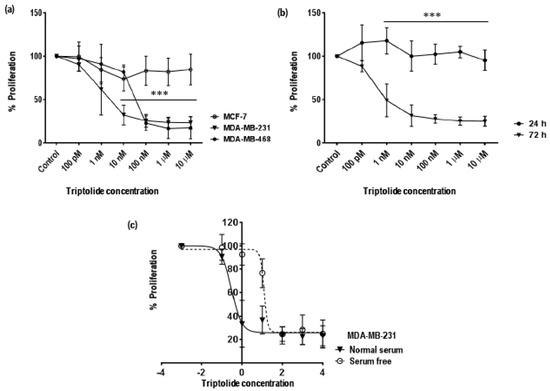 Further analysis of MDA-MB-231 showed a time-dependent response and no significant response was recorded in the first 24 h of triptolide treatment (Figure 1b). However, a response was recorded after 72 h treatment. Next, we analyzed the effect of serum on the sensitivity of MDA-MB-231 cells to triptolide. MDA-MB-231 showed higher sensitivity to triptolide in the presence of serum than without serum in the medium (Figure 1c). Absence of serum from the media showed a distinct trend in the reduction of formazan. The half maximal inhibitory concentration (IC50) of triptolide in MDA-MB-231 under normal serum conditions was 0.3 nM and in serum free condition the IC50 increased to 12.7 nM. Nonlinear regression analysis was used to fit concentration–response data (Figure 1c) with log (inhibitor) vs. response–variable slope (four parameters).