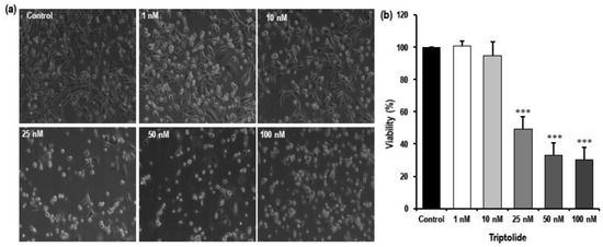 Cells showed indications of toxicity in concentrations from 25 nM to 100 nM. The concentration-dependent effect of triptolide on the cell viability was assessed using trypan blue. Figure 2b shows that the viability of the cells decreased significantly with increasing concentrations of triptolide. Lower concentrations, such as 1 nM and 10 nM, did not differ very much from the control. However, the viability decreased severely in concentrations above 10 nM. A 50% reduction in viability was observed in the 25 nM triptolide concentration (p < 0.0001). The viability was reduced by a further 30% in the 50 nM and 100 nM concentrations (p < 0.0001).