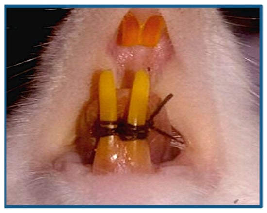 Periodontitis was induced in all rats in accordance with Ionel A. et al. [], as the rats were anesthetized with ketamine hydrochloride (70 mg/kg) and xylazine hydrochloride (10 mg/kg), intraperitoneally. The 4/0 nonresorbable sterile silk threads were used to create a figure of eight ligature around the lower incisors for 14 days (Figure 1), to facilitate the biofilm retention and food accumulation, in order to induce periodontal disease around the lower incisors.