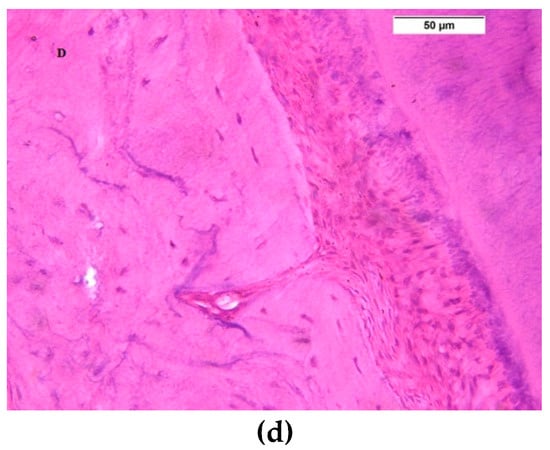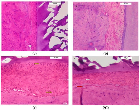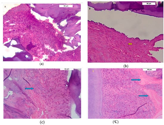 After the four week interval, in comparison to normal, healthy periodontal tissue of control group (Figure 4a), the SRP group was the least organized one in healing (Figure 4b). The ADSCs showed highly cellular periodontal tissue, with the cells are perpendicular to the cementum and alveolar bone, and the most characteristic finding was multiple blood vessels formation (Figure 4c,/C), while the Exo group showed the most healing signs, represented in periodontal tissues with normal width, well-oriented periodontal cells and fibers (Figure 4d).