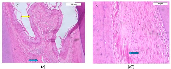 Two days interval. (a) Photomicrograph of the scaling and root planing (SRP) group showing numerous inflammatory cells infiltrating the periodontal ligament and disorganized bone trabeculae (H&E 400×); (b) Photomicrograph of the adipose-derived stem/stromal cell (ADSC) group showing numerous inflammatory cells infiltrating the periodontal tissues (yellow arrow) (H&E 400×); (c) Photomicrograph of the exosomes (Exo.) group showing a large periodontal ligament space filled with a disorganized proliferating periodontal ligament tissue (H&E 400×) and attached to a regular cementum surface. Osteoid tissue (blue arrows) is formed on the bone surface (H&E 400×) in (/C).