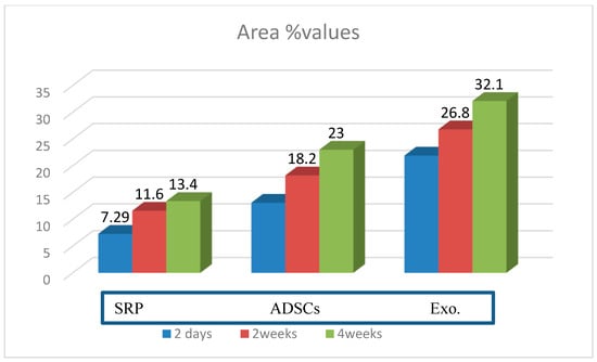The ANOVA test showed significant difference between all groups, Table 1, while the post hoc Tukey test revealed that the area % of newly formed tissues in Exo. group was significantly higher than those of both ADSCs and SRP for all experimental intervals (2 days, 2 weeks, and 4 weeks). Also, ADSCs was significantly higher than SRP group, in all intervals. Table 2, Table 3 and Table 4, Figure 5.