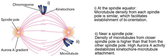 During prometaphase, chromosomes move to the spindle equator, referred to as congression. Chromosome congression is carried out by two different mechanisms depending on the position of chromosomes relative to spindle poles at NEBD [7,8,9]. When chromosomes are between spindle poles at NEBD and directly incorporated in the spindle, bi-orientation is quickly established. Bi-oriented kinetochores attach to the ends of bundled microtubules (K-fiber), which is called end-on attachment, and chromosome congression occurs through elongation or shrinkage of K-fibers. In contrast, a fraction of chromosomes that are located outside of the spindle attach to the lateral surface of microtubules via kinetochores, called lateral attachment. Laterally-attached chromosomes move along microtubules initially towards spindle poles in a Dynein-dependent manner, then to the spindle equator that is driven by chromokinesins and centromere protein E (CENP-E), achieving congression. Bi-orientation is established at the spindle equator, through conversion of lateral attachment to end-on attachment. We and others have reported that cells defective in both lateral and end-on attachment exhibit an extensive loss of connection between chromosomes and microtubules, underscoring the role of lateral attachment in incorporating chromosomes into the spindle [9,10]. In line with previous reports [11,12], we also uncovered the differential contribution of a chromokinesin Kid and CENP-E to the congression of laterally-attached chromosomes, which was clarified under the condition where end-on attachment is suppressed [13]. However, whether congression of chromosomes through lateral attachment contributes to mitotic fidelity in physiological condition has not been revealed yet. A plausible advantage for laterally-attached chromosomes to establish bi-orientation at the spindle equator is that microtubules from each spindle pole exist at a similar density, allowing efficient bi-orientation formation (Figure 1i) [14]. In contrast, when chromosomes are close to one of the spindle poles, kinetochores are prone to attach to microtubules from the closer spindle pole that exist at a higher density, resulting in the formation of erroneous attachments (Figure 1ii). To prevent this, Aurora A, which is concentrated at spindle poles, destabilizes kinetochore-microtubule attachments around spindle poles [15,16]. Therefore, we hypothesized that when chromosome alignment is delayed, late-aligning chromosomes staying near a spindle pole for a prolonged period are difficult to establish bi-orientation, resulting in the increase in the rate of chromosome missegregation. We examined this hypothesis in cancer cell lines depleted of chromokinesins, Kid and KIF4A [8]. We found that late-aligning chromosomes exhibit an increased chromosome missegregation rate, which is supposed to result from a shortened metaphase that is insufficient to establish bi-orientation. Delay or failure in chromosome alignment has been recognized as a consequence of problems in kinetochore-microtubule attachments, but our findings suggest that delayed chromosome alignment per se can be a cause of erroneous kinetochore-microtubule attachments.