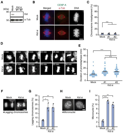 Cells depleted of Kid show delayed chromosome alignment and increased chromosome missegregation. (A) Efficiency of RNAi for Kid in HCT116 cells. Lysate of cells transfected with siRNAs against Kid was subjected to immunoblot analysis using antibodies as indicated; (B) chromosome alignment in cells depleted of Kid. HCT116 cells were transfected with the siRNAs for Kid shown in A, then fixed after 1 h treatment with MG132 and immunostained with an antibody against centromere protein A (CENP-A; green) and α-tubulin (red). DNA was stained with 4′,6-diamidino-2-phenylindole (DAPI; blue). Only a cell depleted of Kid with one of the siRNAs (#1) is shown. Scale bar: 5 μm; (C) proportion of cells with misaligned chromosomes. HCT116 cells treated as in (B) were observed. For each condition, 100 cells were observed. Error bars represent standard deviation (SD) of three independent experiments, and the average of each experimental result is shown as a dot. n.s., not statistically significant (Student’s t-test); (D) mitotic progression of mock and Kid-depleted cells. HCT116 cells expressing histone H2B-mCherry were transfected with or without the siRNAs for Kid and subjected to live cell imaging. Time from nuclear envelope breakdown is shown. Scale bar: 5 μm; (E) duration of prometaphase. For cells treated as in (D), time from nuclear envelope breakdown to completion of chromosome alignment was measured in 50 mitotic cells for each condition. The average is indicated with a bar. n.s., not statistically significant, *** p < 0.0005 (Mann-Whitney U test); (F) chromosome missegregation in cells depleted of Kid. HCT116 cells were transfected with the siRNAs for Kid. After fixation, DNA was stained with DAPI, then, anaphase and telophase cells were observed. Only a cell depleted of Kid with one of the siRNAs (#1) is shown. An arrow indicates lagging chromosomes. Scale bar: 5 μm; (G) proportion of cells with lagging chromosomes. For each condition, 200 HCT116 cells treated as in (F) were observed. Error bars represent SD of three independent experiments, and the average of each experimental result is shown as a dot. * p < 0.05, ** p < 0.005 (Student’s t-test); (H) micronuclei formation in cells depleted of Kid. HCT116 cells were treated as in (F) and interphase cells were observed. Only a cell depleted of Kid with one of the siRNAs (#1) is shown. An arrow indicates a micronucleus. Scale bar: 5 μm; (I) proportion of cells with micronuclei. HCTT16 cells treated as in (F) were observed for the presence of micronuclei as shown in (H). For each condition, 1000 cells were observed. Error bars represent SD of three independent experiments, and the average of each experimental result is shown as a dot. ** p < 0.005, *** p < 0.0005 (Student’s t-test).