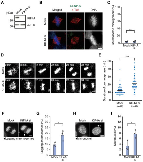 Additionally, we addressed the effect of depletion of KIF4A, another chromokinesin of the kinesin-4 family, which was also reported to be involved in chromosome congression [12,24] (Figure 3A). KIF4A-depleted cells did not show an increase in chromosome misalignment (Figure 3B,C), however, the time required for chromosome alignment was increased slightly but significantly (Figure 3D,E), as in Kid-depleted cells. KIF4A-depleted cells also showed an increase in the appearance of lagging chromosomes (Figure 3F,G), as well as the rate of micronuclei-containing cells (Figure 3H,I) and the percentage of cells with abnormal chromosome numbers (Figure S2).