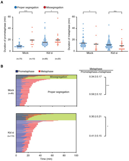 Cells that underwent chromosome missegregation exhibit an elongated prometaphase and a shortened metaphase. (A) Duration of prometaphase and metaphase depending on the occurrence of chromosome missegregation. HCT116 cells expressing H2B-mCherry were transfected with or without the siRNA for Kid (#1) and subjected to live cell imaging. Time from nuclear envelope breakdown to anaphase onset was measured in at least 80 mitotic cells for each condition, and categorized by the occurrence of chromosome missegregation. Number of cells observed is shown. The average is indicated with a bar. n.s., not statistically significant, * p < 0.05, *** p < 0.0005 (Mann-Whitney U test); (B) duration of prometaphase and metaphase in each cell in (A) is indicated with a bar, categorized by the occurrence of chromosome missegregation. Number of cells observed is shown. Ratio of metaphase time to the sum of prometaphase and metaphase time for each category is shown (mean ± SD). * p < 0.05, *** p < 0.0005 (Student’s t-test and Welch’s t-test).