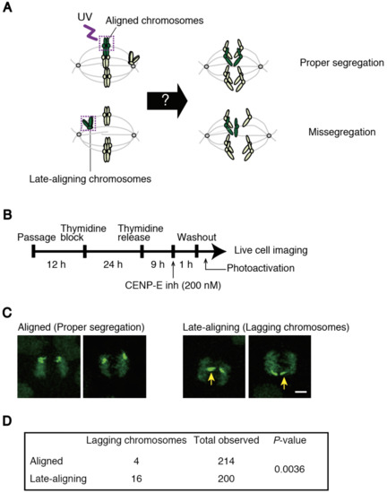 To clarify the causal relationship between delayed chromosome alignment and increased chromosome missegregation, we developed an assay to track late-aligning chromosomes, and found that they exhibit a higher incidence of lagging chromosomes (Figure 5C,D). This data suggest that late-aligning chromosomes are inclined to form erroneous kinetochore-microtubule attachments. To confirm the tendency found in normal cycling cells (Figure S4), we treated cells with a CENP-E inhibitor to enrich cells containing polar chromosomes. This is an artificial condition that is supposedly different from spontaneous alignment delay, but still represents chromosomes locating in the vicinity of spindle poles, in which kinetochores are mostly devoid of microtubules [12,31,32]. We need to bear in mind, however, that CNEP-E has been suggested to play a role in stabilization of end-on attachment [31,33]. Therefore, there remains a possibility that a residual effect of the CENP-E inhibitor after washout might affect bi-orientation establishment. Even though most of the lagging chromosomes we found in the tracking finally segregated equally as previously reported [34], a small fraction of lagging chromosomes may lead to aneuploidy or micronuclei formation. We compared chromosome missegregation rate between late-aligning and aligned chromosomes; however, an ideal comparison would be the tracking of chromosomes randomly-labeled at the beginning of mitosis, which was difficult because multiple chromosomes are inevitably labeled by photoactivation of clustered chromosomes in early mitosis. Differential painting of chromosomes, which is now feasible using CRISPR/Cas9 technology [35], may circumvent the problem.