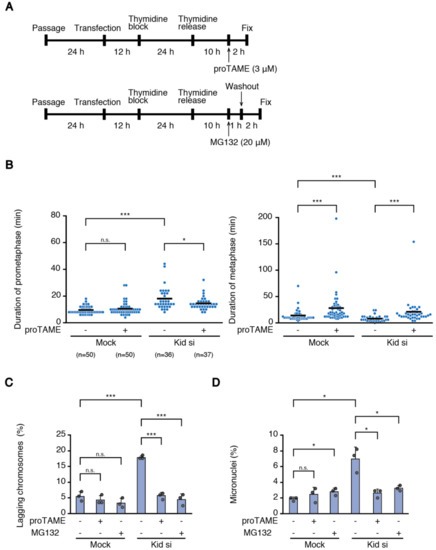 It was reported that correction of erroneous kinetochore-microtubule attachments occurs not only in prometaphase, but also in metaphase [14]. Our data that cells that underwent chromosome missegregation exhibit elongated prometaphase and shortened metaphase (Figure 4) suggest that these cells do not have sufficient time to correct erroneous kinetochore-microtubule attachments during metaphase. Therefore, we examined whether increasing the metaphase duration by delaying anaphase onset improved the mitotic fidelity of cells showing delayed chromosome alignment. To delay anaphase onset, we treated cells with a low dose of proTAME, an inhibitor of anaphase promoting complex/cyclosome (APC/C) (Figure 6A). We confirmed that HCT116 cells treated with 3 μM proTAME did not arrest cells in metaphase, but delayed anaphase onset, while prometaphase duration did not change (Figure 6B). As another means to delay anaphase onset, we transiently treated cells with MG132 that inhibit anaphase onset (Figure 6A). To delay chromosome alignment, we depleted Kid in HCT116 cells, then treated cells with or without proTAME/MG132, and observed chromosome missegregation or micronuclei formation (Figure 6C,D). As shown previously, Kid-depleted cells showed an increased rate of lagging chromosomes as well as micronuclei formation (Figure 6C,D). Intriguingly, both proTAME and MG132 treatment significantly reduced the frequency of lagging chromosomes and micronuclei formation in Kid-depleted cells (Figure 6C,D). Our data suggest that lack of time for error correction during metaphase promotes missegregation of late-aligning chromosomes, which can be rescued by delaying anaphase onset.