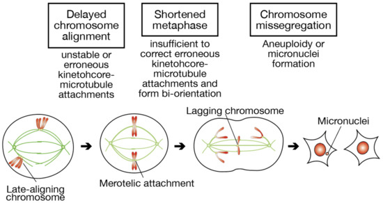 For proper mitotic chromosome segregation, sister kinetochores on a replicated chromosome pair have to attach to microtubules from opposite spindle poles, which is called amphitelic attachment, or bi-orientation. As kinetochores can attach to microtubules only after nuclear envelope breakdown (NEBD) in cells that undergo open mitosis, elaborate mechanisms exist to ensure the establishment of bi-orientation for all the sister kinetochores at every mitosis. Failure in this process leads to chromosome missegregation that results in abnormal numbers of chromosomes, known as aneuploidy, which is common in cancer [1]. Chromosomal instability (CIN), a condition in which chromosome missegregation occurs at a high rate, usually underlies the occurrence of aneuploidy in cancer [2,3]. During the process to establish bi-orientation, erroneous kinetochore attachments to microtubules can occur, such as monotelic, syntelic, or merotelic attachment [4,5]. Aurora B, a mitotic kinase, plays a role in the correction of these erroneous attachments by destabilizing them, while the spindle assembly checkpoint (SAC) halts mitotic progression in the presence of unattached kinetochores, allowing time for error correction. Among these erroneous attachments, merotelic attachment, in which a single kinetochore attaches to microtubules from both spindle poles, is considered a major cause of CIN, as it is not sensed by the SAC because the kinetochore is attached to microtubules and under tension exerted by pulling force from both spindle poles that stabilizes the attachment [6]. Uncorrected merotelic attachment gives rise to lagging chromosomes, which can be a cause of both numerical and structural chromosome abnormalities as well as formation of micronuclei [2]. Several conditions that promote the formation of merotelic attachment have been reported, including overamplification of centrosomes, weakening of Aurora B activity, and hyperstabilization of microtubules [2]. However, the whole picture of the causes for merotelic attachment that leads to CIN in cancer has not been revealed.
